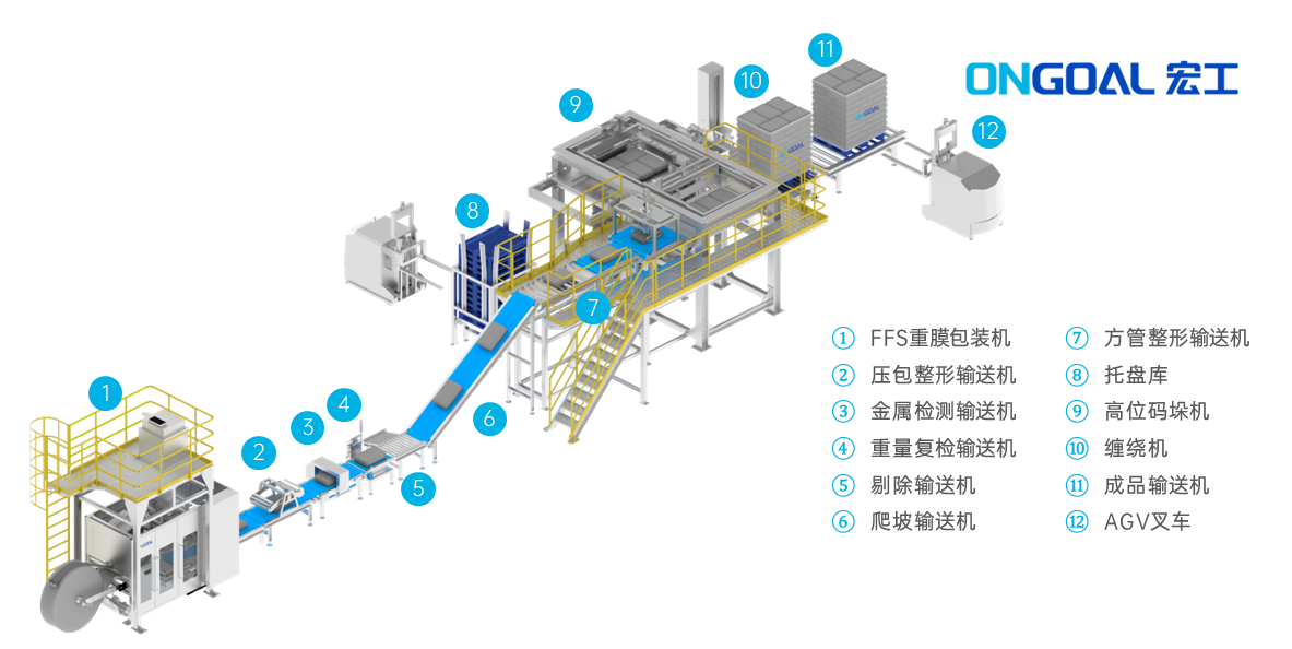除了核心单机,宏工科技还可提供包含包装、整形输送、金检、复称、剔除、机器人/ 高位码垛、缠绕膜/套膜、AGV叉车转运的一站式包装解决方案。